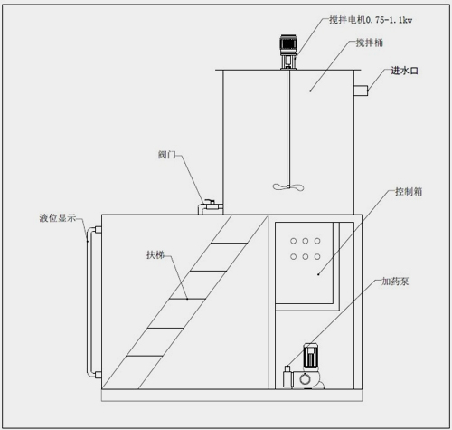 1、溶藥箱1臺(tái) 2、攪拌機(jī)1臺(tái) 3、存藥箱1臺(tái) 4、扶梯1臺(tái) 5、控制箱1臺(tái) 6、管道1套 7、磁力加藥泵1臺(tái)