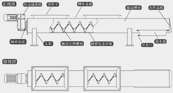 該壓榨機(jī)輸送壓榨殼體采用U型槽式結(jié)構(gòu),上部封蓋板,為增加出料高度,一般為平送出料。 壓榨螺旋采用無(wú)軸螺旋,下襯耐磨尼龍襯板,增加了輸送長(zhǎng)度,壓榨部分為平送壓榨結(jié)構(gòu)。 可同時(shí)接受多臺(tái)格柵出料,輸送加壓榨一體,減少了動(dòng)力消耗及設(shè)備投資。